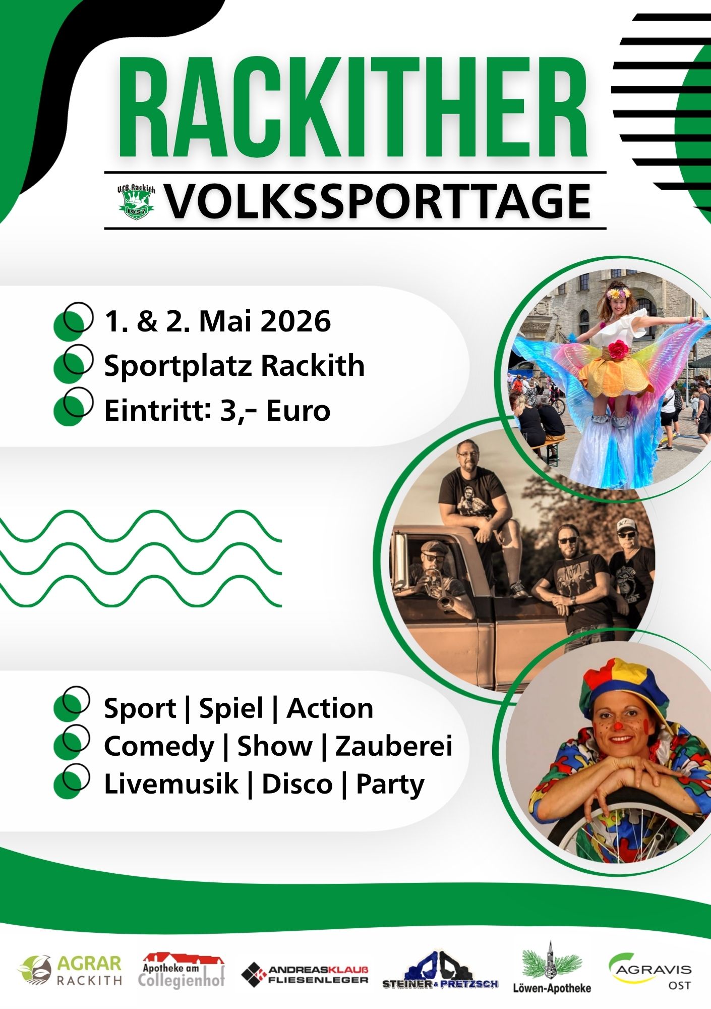Der Rackither Sportplatz wird am 2. und 3. Mai 2025 zum Schauplatz der 47. Rackither Volkssporttage, einem Fest für die ganze Familie, das Sport, Spiel und Unterhaltung vereint. Die Veranstaltung verspricht ein abwechslungsreiches Programm, das sowohl sportliche Wettkämpfe als auch kulturelle Highlights umfasst.